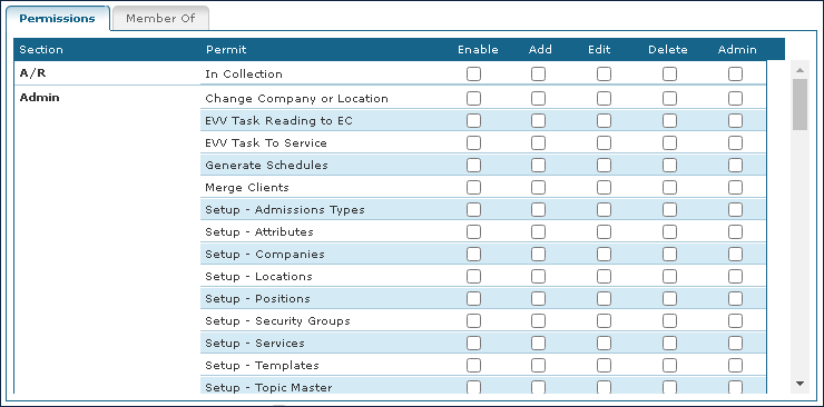The Permissions tab on the Security Groups window displays the security group’s user permissions for different sections of the system.
