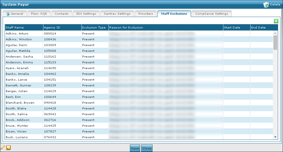 The Staff Exclusions tab displays the list of all field staff marked for exclusion from employment associated with the payer.