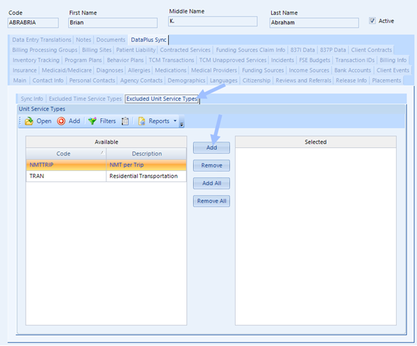 - Select the Excluded Time Service Types tab and add (or remove) and time service types that this client does not receive that others at the same service locations can.