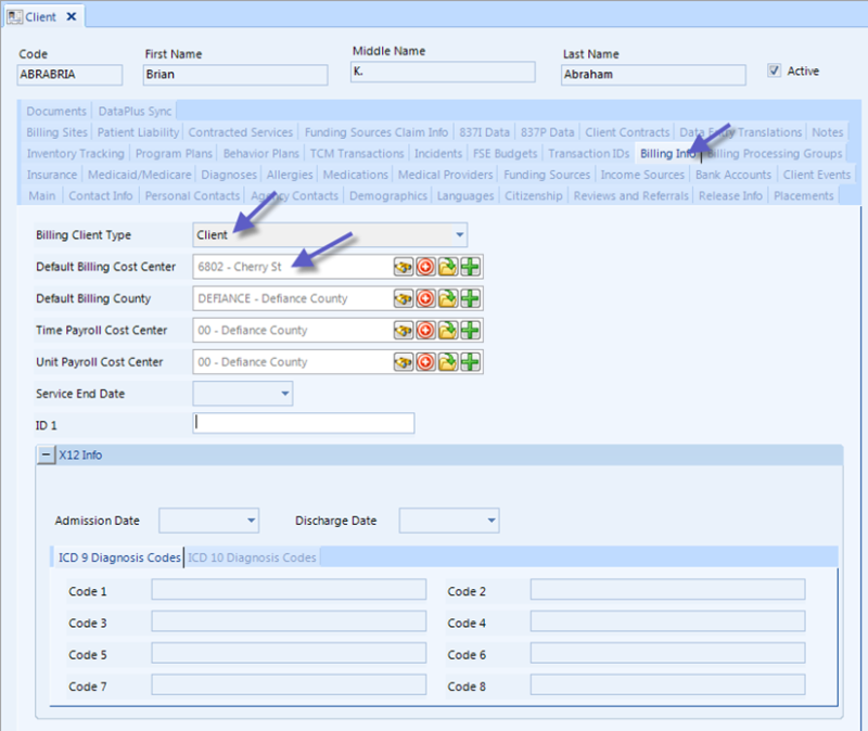 Make sure the correct Billing Client Type and Default Billing Cost Center is set.