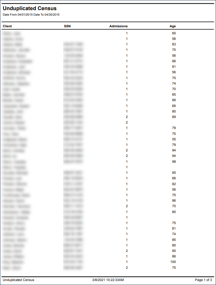 This report displays a list of discrete clients who were admitted within the selected date range. Regardless of the number of times a client is admitted, they will only appear once in the total client count. Client, SSN, Admissions and Age fields are listed for each client.