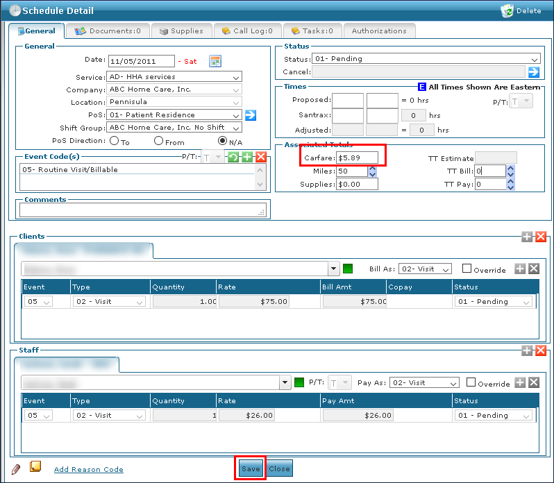 A ‘Carfare Exception’ displays when an incorrect amount of Car Fare is reported by the staff member. This amount can be affected by mileage, tolls, or other associated costs.