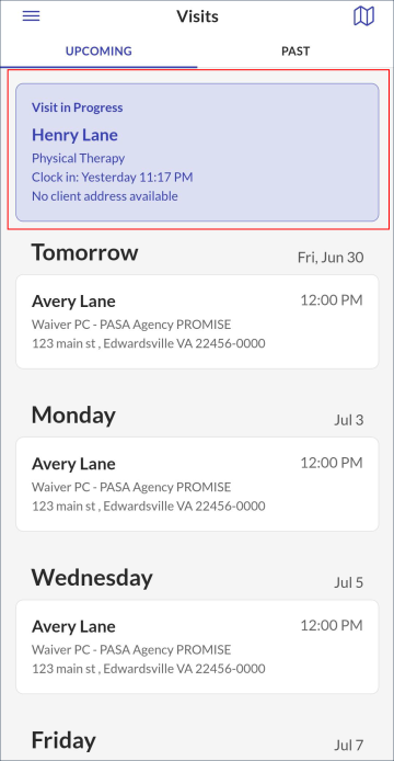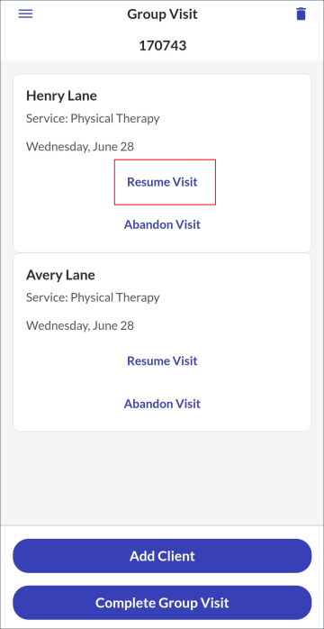 Employees can complete visits for individual clients in the group, but the group visit remains active until each employee has completed all visits for all clients associated with that group visit.