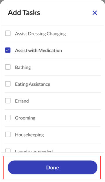 The TASKS tab allows you to record the completion of any tasks performed during the visit. Some accounts are configured to use a Plan of Care (PoC). When a client has a PoC, the required task will display in the TASKS tab. Select the tasks completed from this list. Depending on the account set up, the service selected for the visit limits the tasks selection to that service.