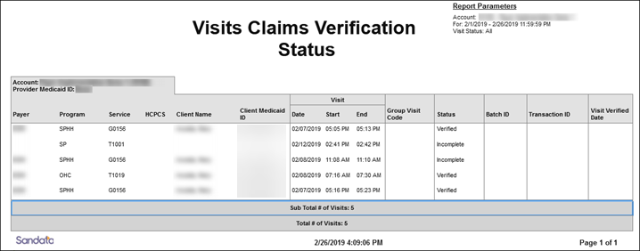 Use this report to track the status of visits relative to claims validation. It can be used to review when a particular visit was returned to the adjudicating system.