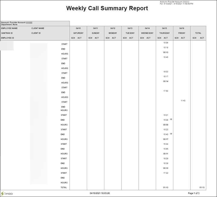 This report displays a summary view of all calls placed for the selected week in a weekly grid format, sorted by employee. The report includes information about each call, the client, the employee, and general information about each call. The report includes scheduled and actual times for each call as well as the call duration. If adjusted call times exist for the visit, they are displayed on this report. If no adjusted times exist, the actual call time is displayed.