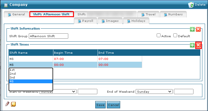 1. Navigate to the desired Shift tab on the Companies window. Main Menu > Admin > System Setup > Companies > Shift Group 2. Click on the shift to be removed. 3. Click Delete Shift. 4. Click Save. |