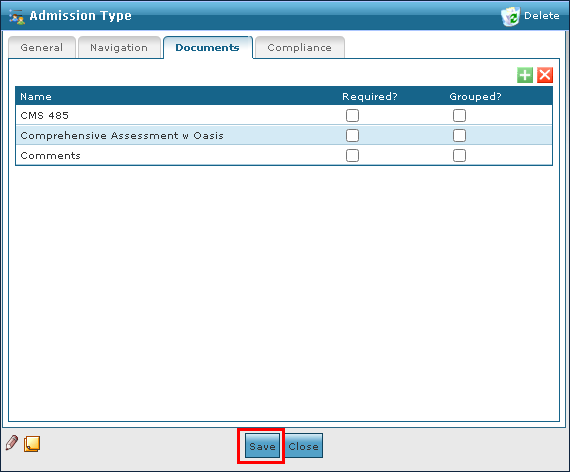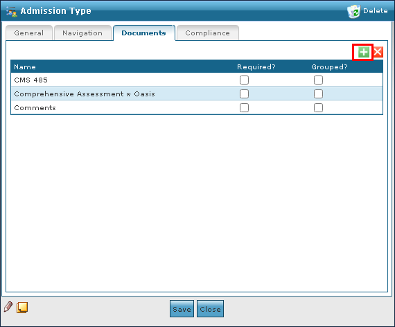 1. Navigate to the Documents tab on the Admission Type window. Main Menu > Admin > System Setup > Admission Type > Documents 2. Click Add New Document. |