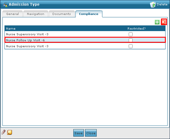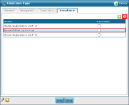 1. Navigate to the Compliance tab on the Admission Type window. Main Menu > Admin > System Setup > Admission Type > Compliance 2. Click on the document to be removed. 3. Click Delete Document. |