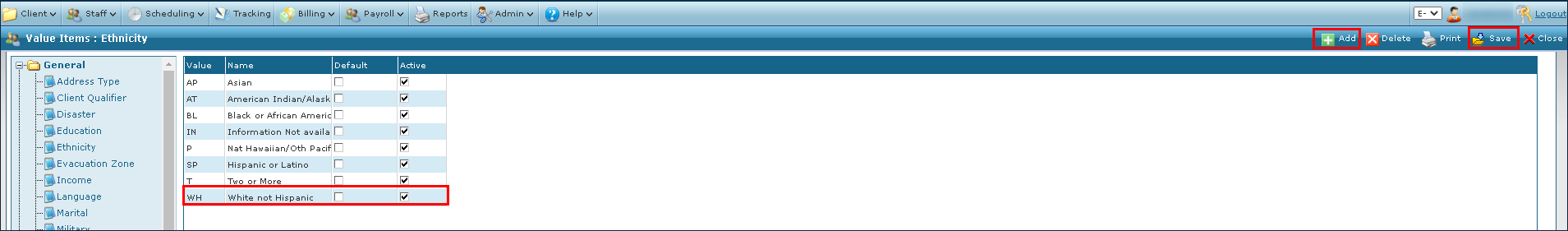 1. Navigate to the Value Items screen. Admin > System Setup > Value Items 2. Click on the section to add the value item. 3. Click Add. 4. Use the fields to enter the value item information as needed. 5. Click Save. |