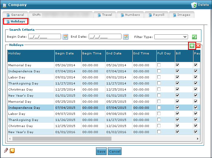 1. Navigate to the Holidays tab on the Companies window. Main Menu > Admin > System Setup > Companies > Holidays 2. Click Add New Holiday. |