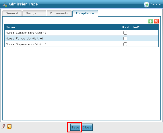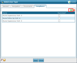 1. Navigate to the Compliance tab on the Admission Type window. Main Menu > Admin > System Setup > Admission Type > Compliance 2. Click Add Document. |