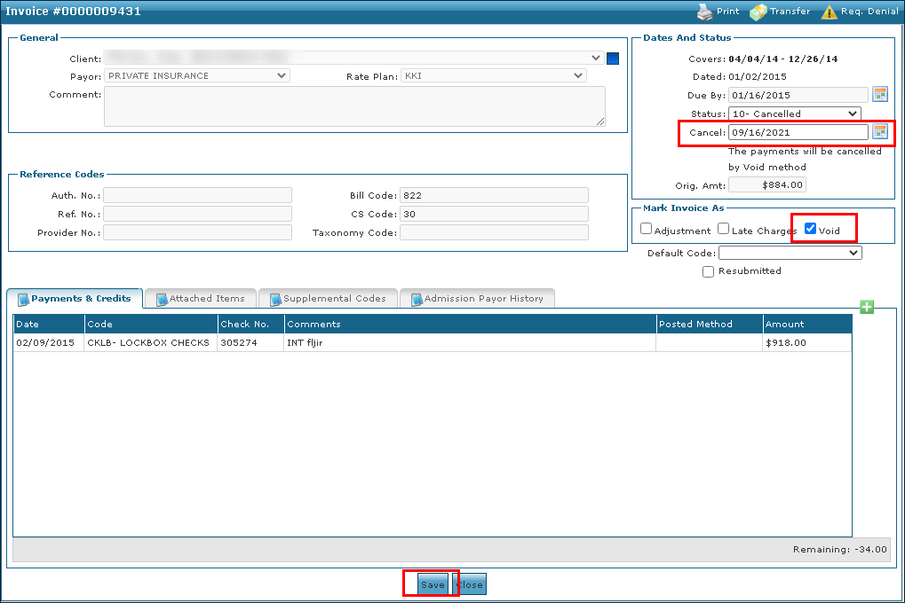 4. Select a Cancel date. 5. Select the Void checkbox. 6. Click Save. The Invoice is voided. |