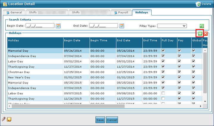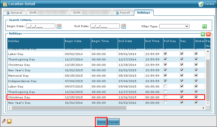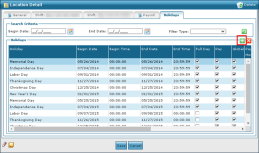 1. Navigate to the Holidays tab on the Locations Detail window. Main Menu > Admin > System Setup > Locations > Location > Holidays 2. Click Add New Holiday |