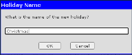 4. Click Ok. 5. Use the fields to enter the holiday information. 6. Click Save. |