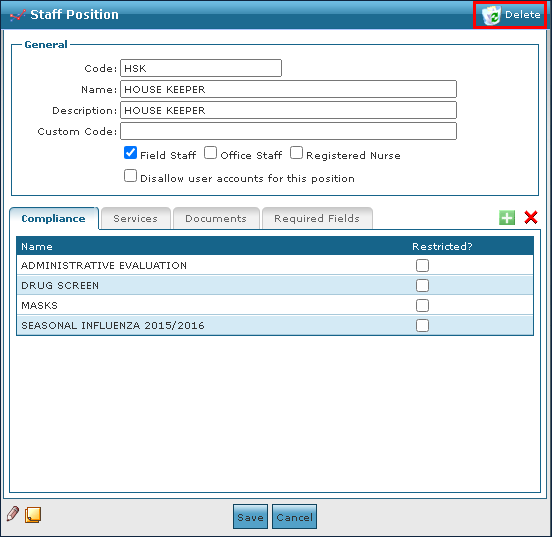 Sandata Technologies Product Help Sandata Agency Management System Setup Removing a Position from the System To remove an invalid or out of date position: 1. Navigate to the Staff Positions screen. Main Menu > Admin > System Setup > Staff Positions 2. Double click on the position needing removal. 3. Click Delete. 4. Click Ok. Zendesk Designer.5.log-1117815581.zip10 KB Comments 0 comments Please sign in to leave a comment.