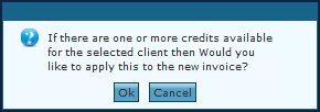 8. Click OK to apply any pre-payments, remaining balances, or existing credits. or click Cancel to begin creating the invoice. |