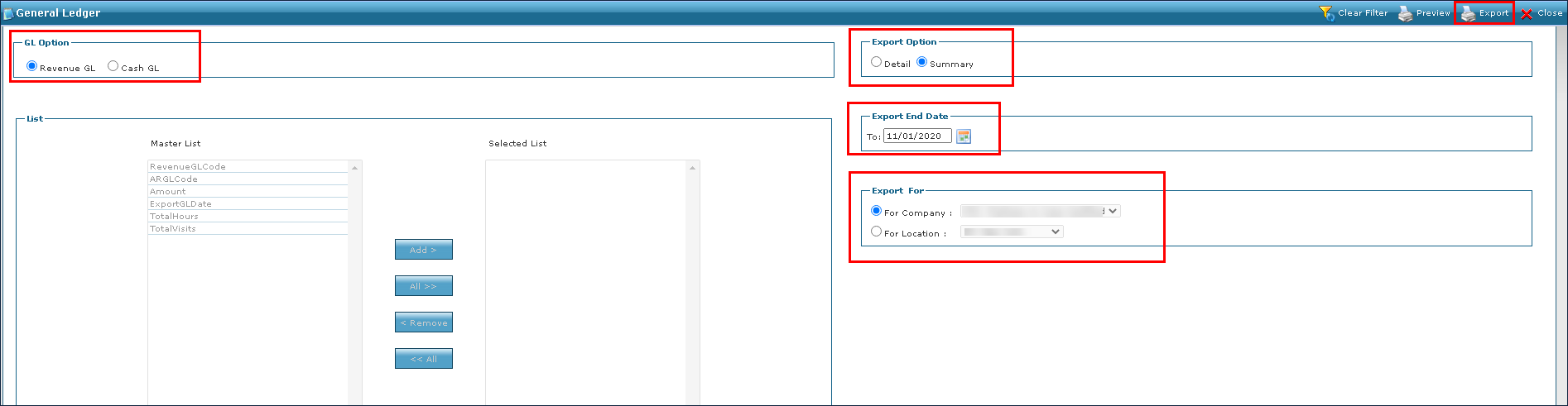 1. Navigate to the General Ledger screen. Main Menu> Billing > GL Export 2. Select Revenue GL in the GL Option box. 3. Select Summary in the Export Option box. 4. Choose the final date of the export in the Export End Date box. 5. Choose the Company or Location from the drop down in the Export For box. 6. Click Export. |