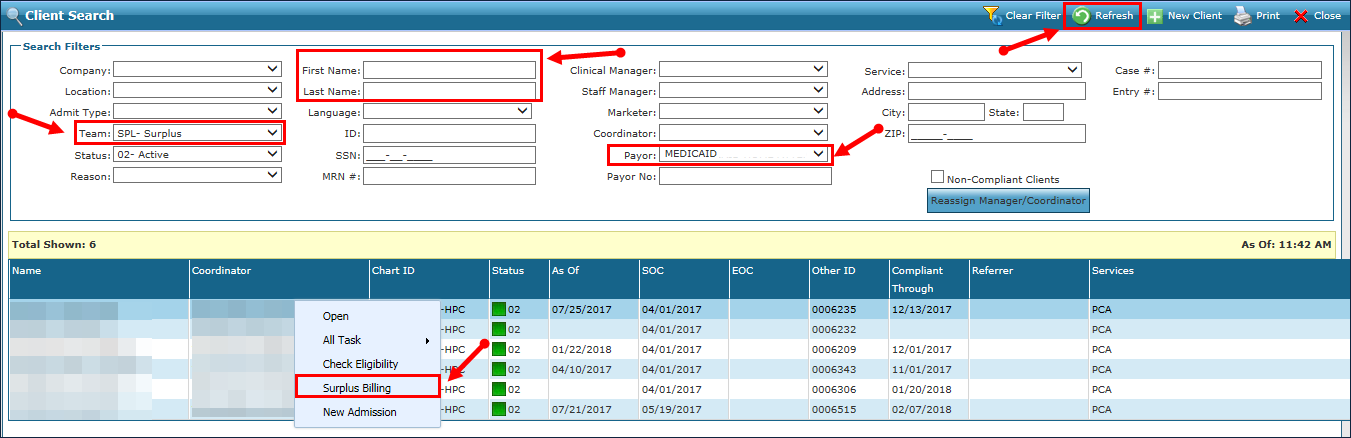 1. Navigate to the Client Search screen. Main Menu > Client 2. Select the applicable Search Filters to display the client(s) using surplus billing. 3. Click Refresh. 4. Select the client(s) from the search results. 5. Right-click to open a pop window. 6. Select Surplus Billing. |