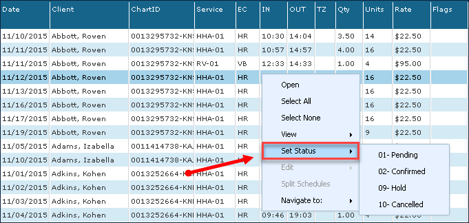 On the Billing Review screen, Set Status can be used to change the status of events without having to open the Schedule Detail screen. This is helpful for tasks such as bulk editing or getting an item ready to bill after resolving an exception.