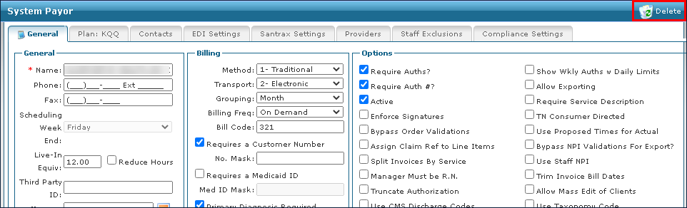 4. Double click on the payer to open the System Payer window. 5. Click Delete. |