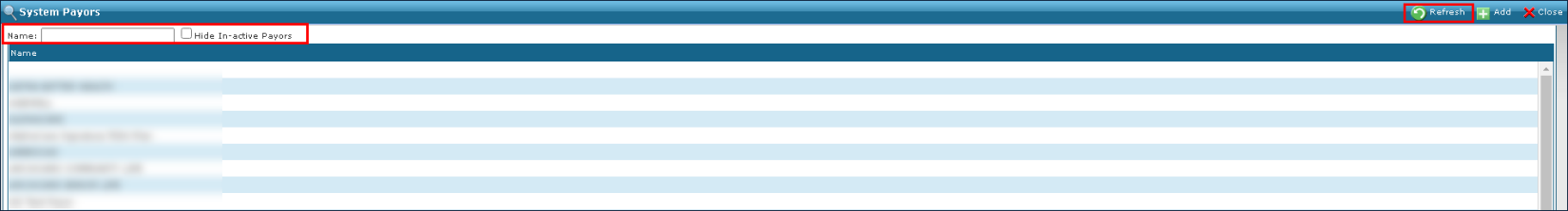 1. Navigate to the Payors screen. Main Menu > Billing > Payors 2. Use the search filters to locate the payer by name. 3. Click Refresh. |