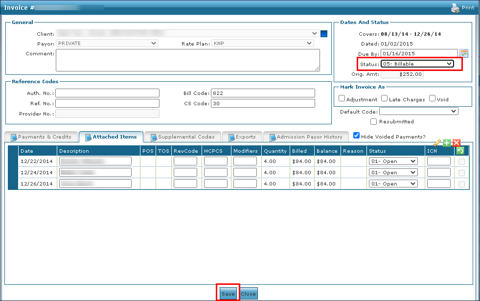 3. Make any corrections to the invoice as needed. 4. Set the invoice status to 05-Billable. 5. Click Save. The invoice is now billable and ready to be included in the next export. |