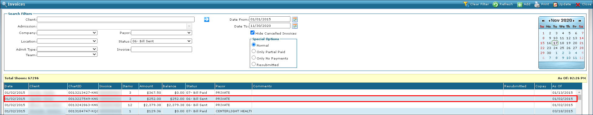 1. Navigate to the Invoices screen. Billing > Invoices 2. Use the search filters to locate the rejected invoice. Double click on the invoice to open it. |