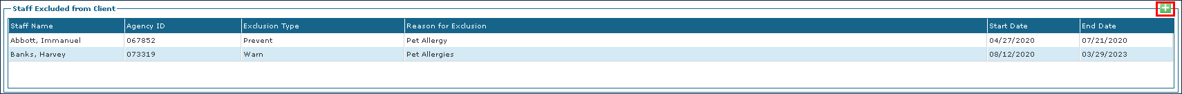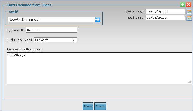 5. Locate and double click on the staff member using the filters and enter the exclusion details. 6. Click Save. The exclusion is added to the client’s admission. |