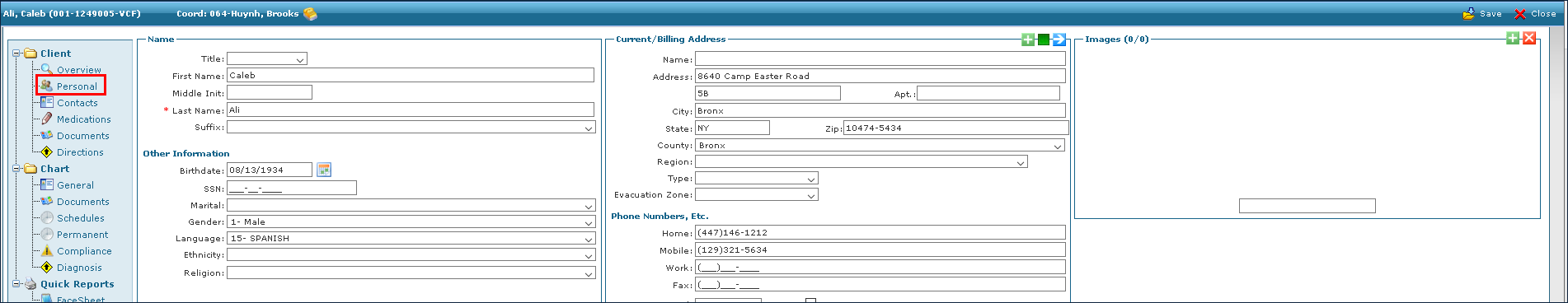 1. Navigate to the Client Search screen. Main Menu > Client 2. Locate and double click on the client using the search filters. 3. Click Personal. |