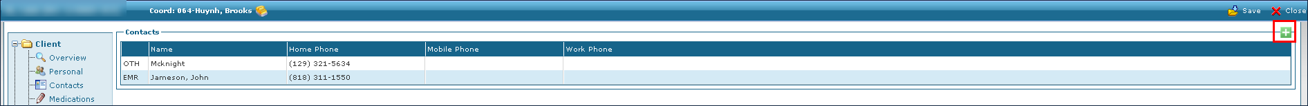 Contacts are normally added during admission but can also be supplemented later. To add a contact to a client’s admission: