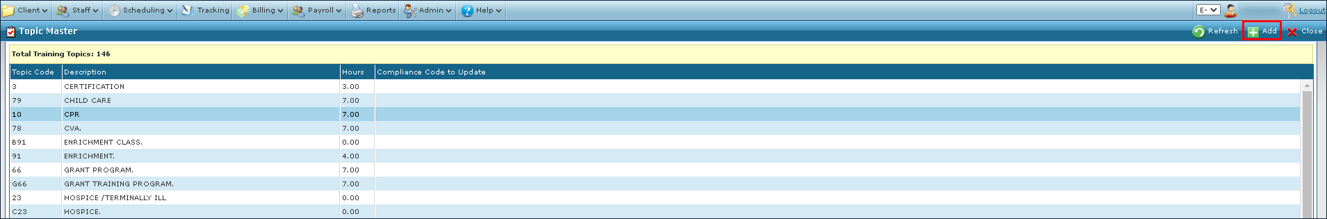 Sandata Technologies Product Help Sandata Agency Management System Setup Adding a New Topic to the System To add a new topic for training: 1. Navigate to the Topic Master screen. Main Menu > Admin > System Setup > Topic Master 2. Click Add New Topic. 3. Use the fields to enter the topic information as needed. 4. Click Save. Zendesk Designer.5.log-1117815581.zip10 KB Comments 0 comments Please sign in to leave a comment.