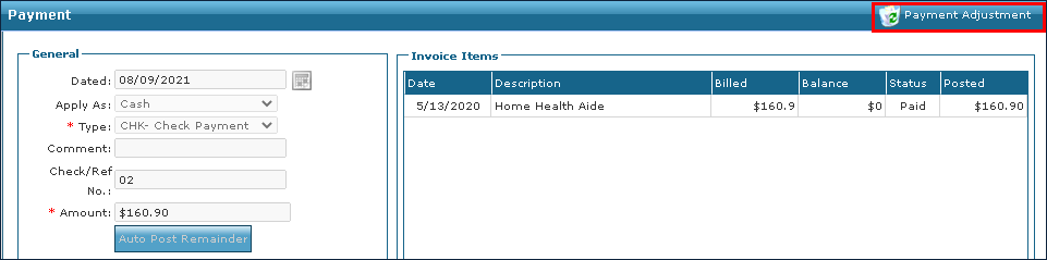3. Click Payment Adjustment. The Payment Adjustment window displays. |