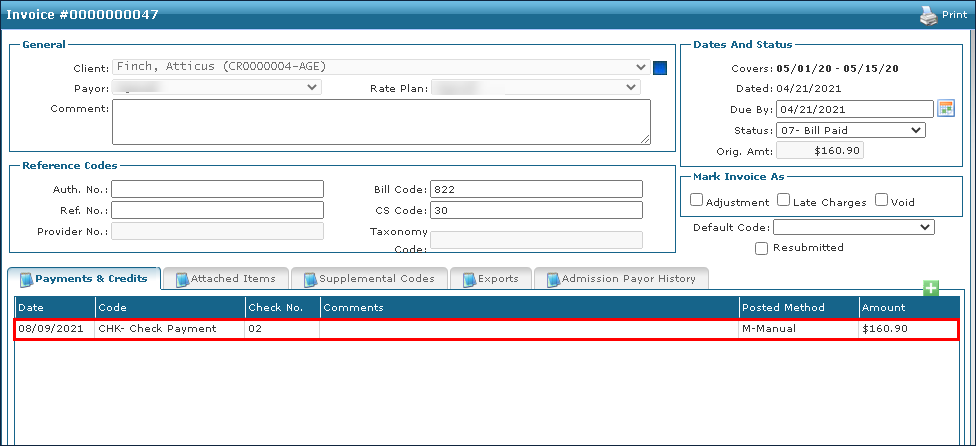 1. Locate and open the invoice needing correcting. 2. Double click on the payment with the incorrect information. The Payment Window displays. |