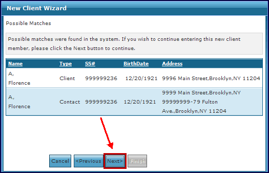 5. Select an existing client. If the system finds a client with the same or a similar name as the one being entered, the system identifies and displays possible matches. 6. Select an existing client from the possible matches and click the Next button, or for new clients make no selection and click the Next button. |