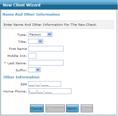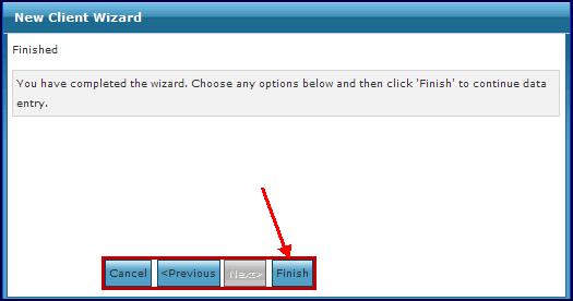 10. Click the Finish button. Clicking the Cancel button at any point during the wizard closes the window and returns you to the Client Search screen without saving. Click the Previous button to revise any information entered (if necessary). |
