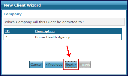 7. Select the name of the Company that is associated with this client and click the Next button. |