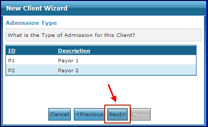 9. Select the Admission Type that is associated with this client and click Next. |