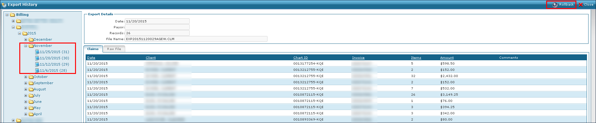 1. Navigate to the Export History screen. Billing > History 2. Locate the rejected claim. 3. Click Rollback. |