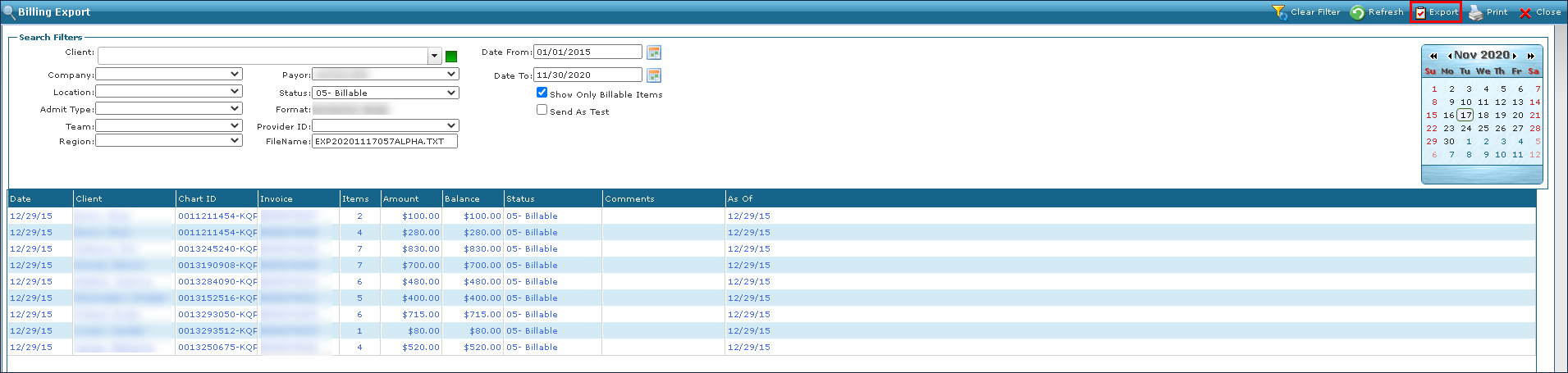 6. Navigate to the Billing Export screen. Billing > Export 7. Use the search filters to locate the invoices now set to 05-Billable. 8. Click Export. |