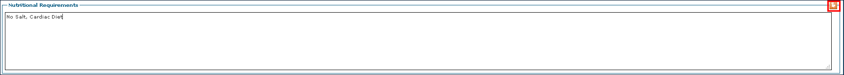Nutritional Requirements can be added to the Client Profile by clicking into the box and adding text or by using a preexisting template. To add nutritional requirements to a client’s admission: