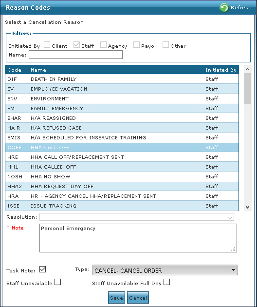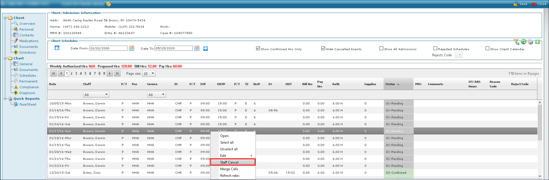 1. Navigate to the Client Search screen. Main Menu > Client. 2. Locate and double click on the client using the search filters. 3. Click Schedules. 4. Use the filters and check boxes to select the starting and ending dates for the schedules to be viewed. 5. Click Refresh. 6. Right click on the schedule to be edited. 7. Click Staff Cancel. |