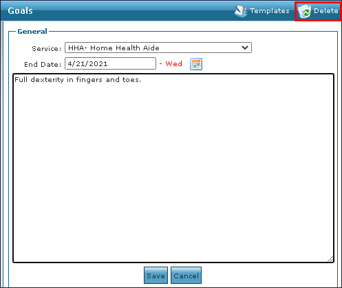 1. Navigate to the Client Search screen. Main Menu > Client 2. Locate and double click on the client using the search filters. 3. Click Goals. 4. Double click on the goal to be removed. |