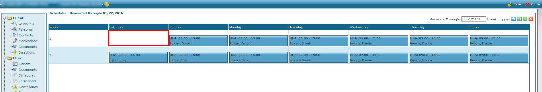 1. Navigate to the Client Search screen Main Menu > Client 2. Locate and double click on the client using the search filters. 3. Click Permanent. 4. Right click in the Schedules Generated Through area and click Delete Template. |