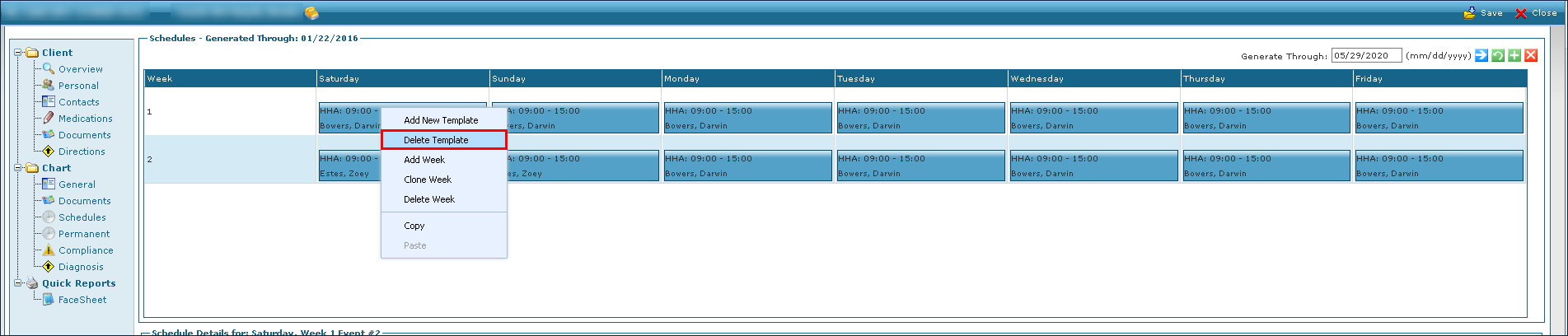 The Delete Template option is used to remove a previously created event template from a client’s permanent schedule.