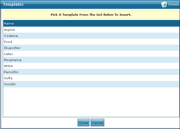 4. Click Insert a Template. To add a new allergy, click Add Text As New Template and enter the allergy name. |