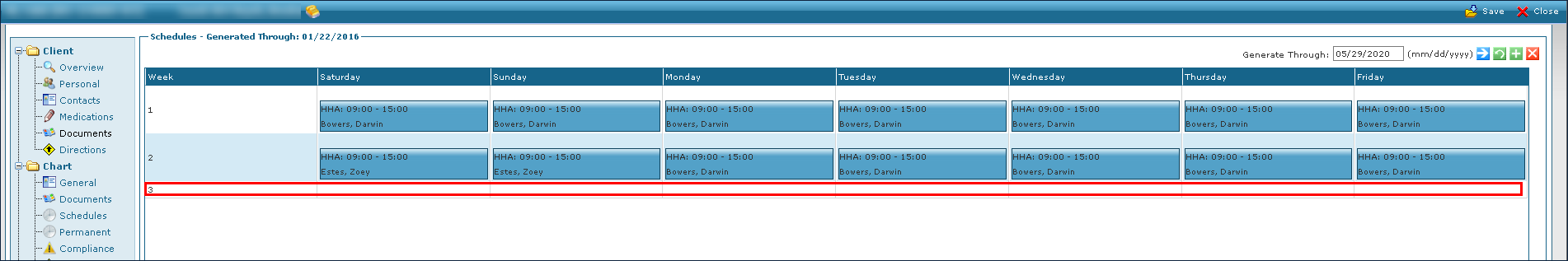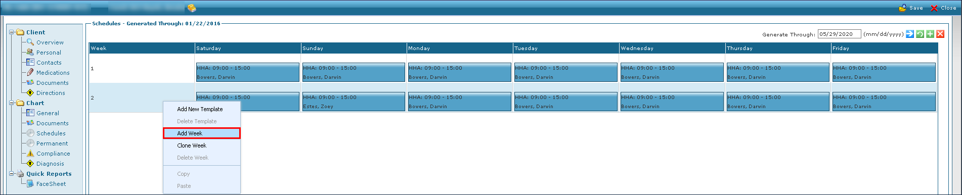 1. Navigate to the Client screen Main Menu > Client 2. Locate and double click on the client using the search filters. 3. Click Permanent. 4. Right click in the Schedules Generated Through area and click Add Week. Template space for seven new days is added. |