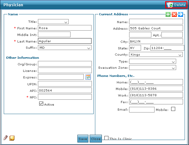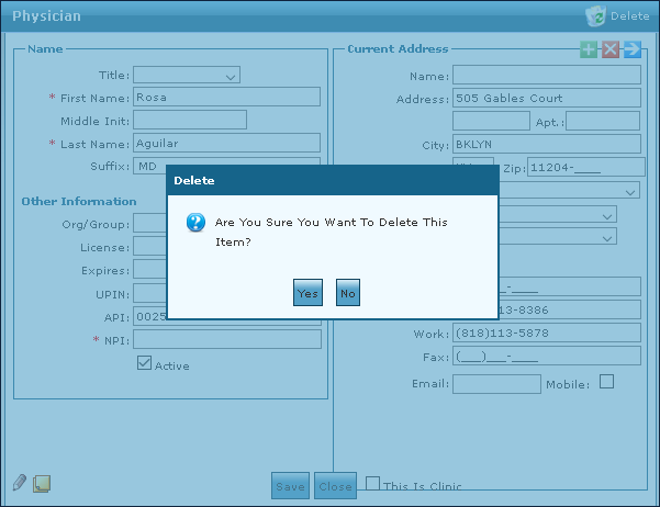 Sandata Technologies Product Help Sandata Agency Management Client Physician Information Removing a Physician To remove a physician from the system: 1. Navigate to the Physicians Screen. Main Menu > Client > Physicians 2. Locate the physician using the search filters. 3. Double click on the physician’s name. 4. Click Delete. 5. Click Yes. Zendesk Designer.5.log-1117815581.zip10 KB Comments 0 comments Please sign in to leave a comment.