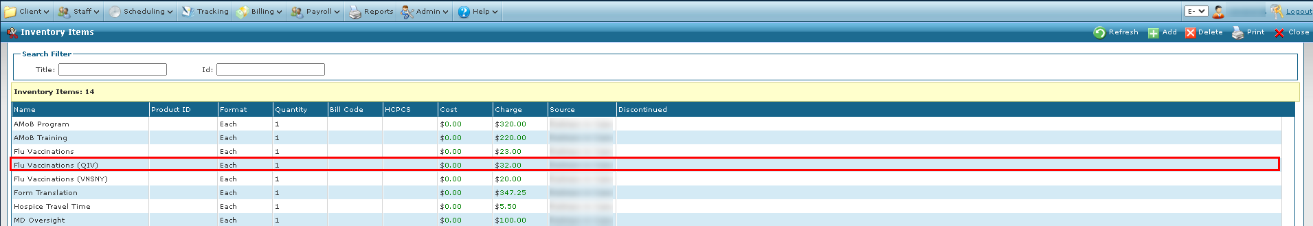 1. Navigate to the Inventory Items screen. Main Menu > Scheduling > Inventory > Inventory Items 2. Double click on the item to be edited. |