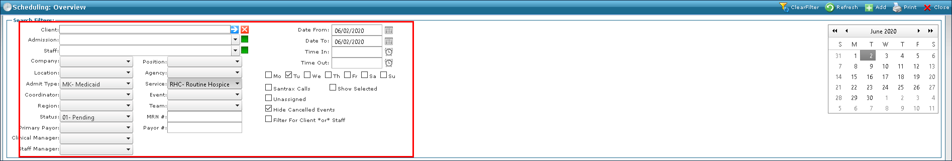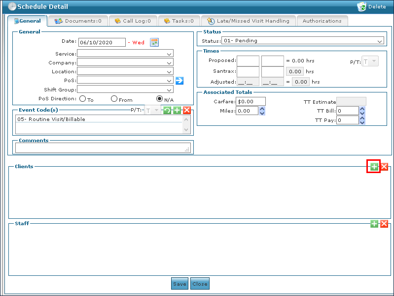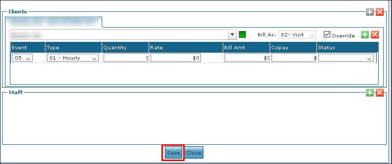 4. Use the filters to locate the client to be added. 5. Select the Override check box if the client information does not auto populate and enter the appropriate information. 6. Enter the rest of the schedule information as needed. Click Save. |